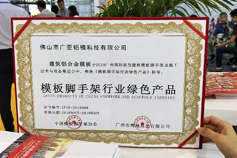 廣亞鋁模榮獲中國(guó)模板腳手架行業(yè)綠色產(chǎn)品證書
