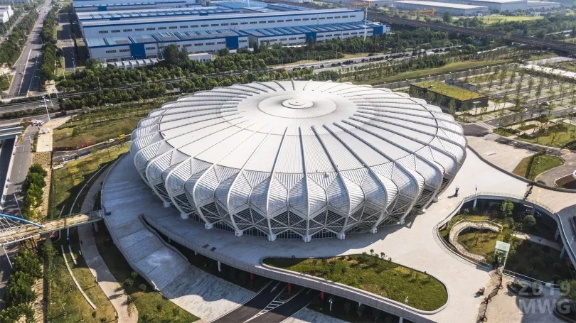 湖北省奧體中心綜合館是軍運(yùn)會(huì)體操(男子)項(xiàng)目比賽主場館,整個(gè)外立面設(shè)計(jì)靈感來自于羽毛球造型,由36個(gè)單元環(huán)形陣列組成,整體觀感極為驚艷。