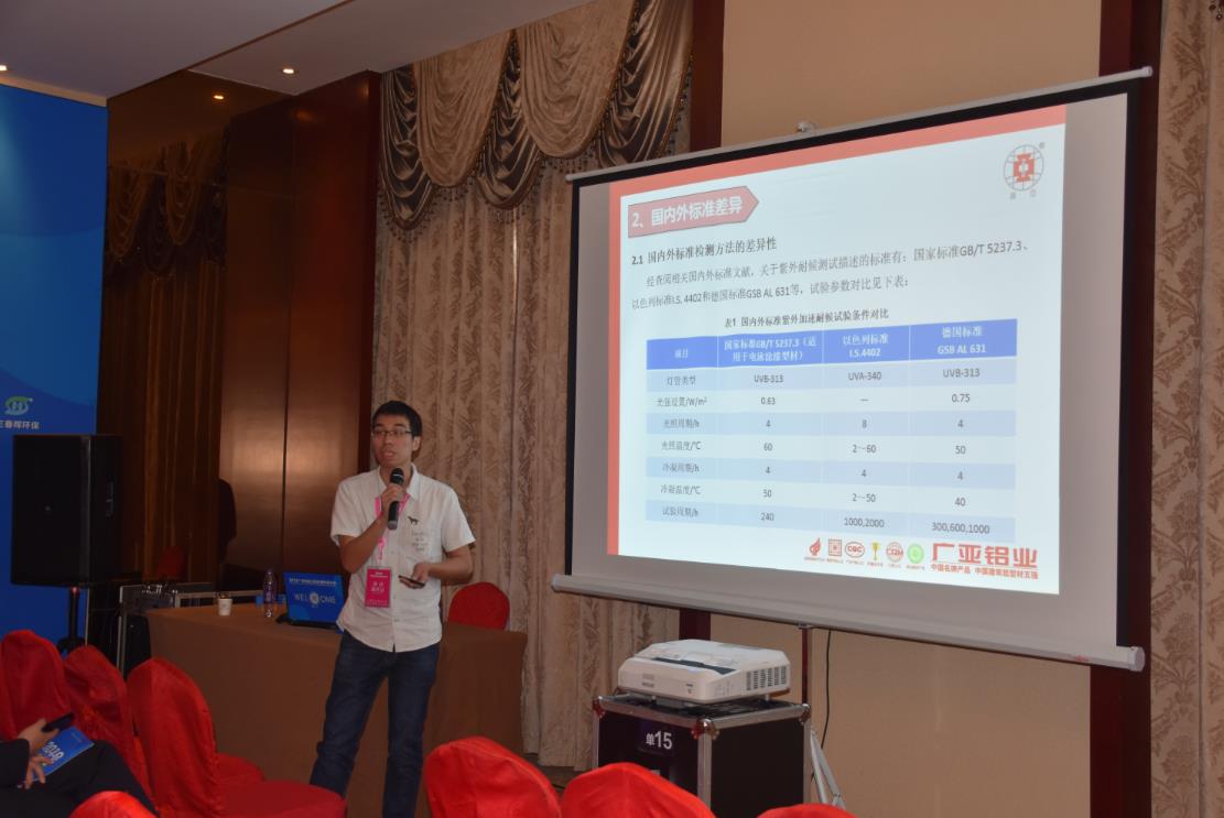 設(shè)備、環(huán)保、檢測與輔料專題研討會上,廣亞鋁業(yè)檢測中心主任梁裕鏗在會上分享了主題《鋁合金噴粉型材紫外加速耐候測試與自然耐候測試結(jié)果的對比分析》的演講。