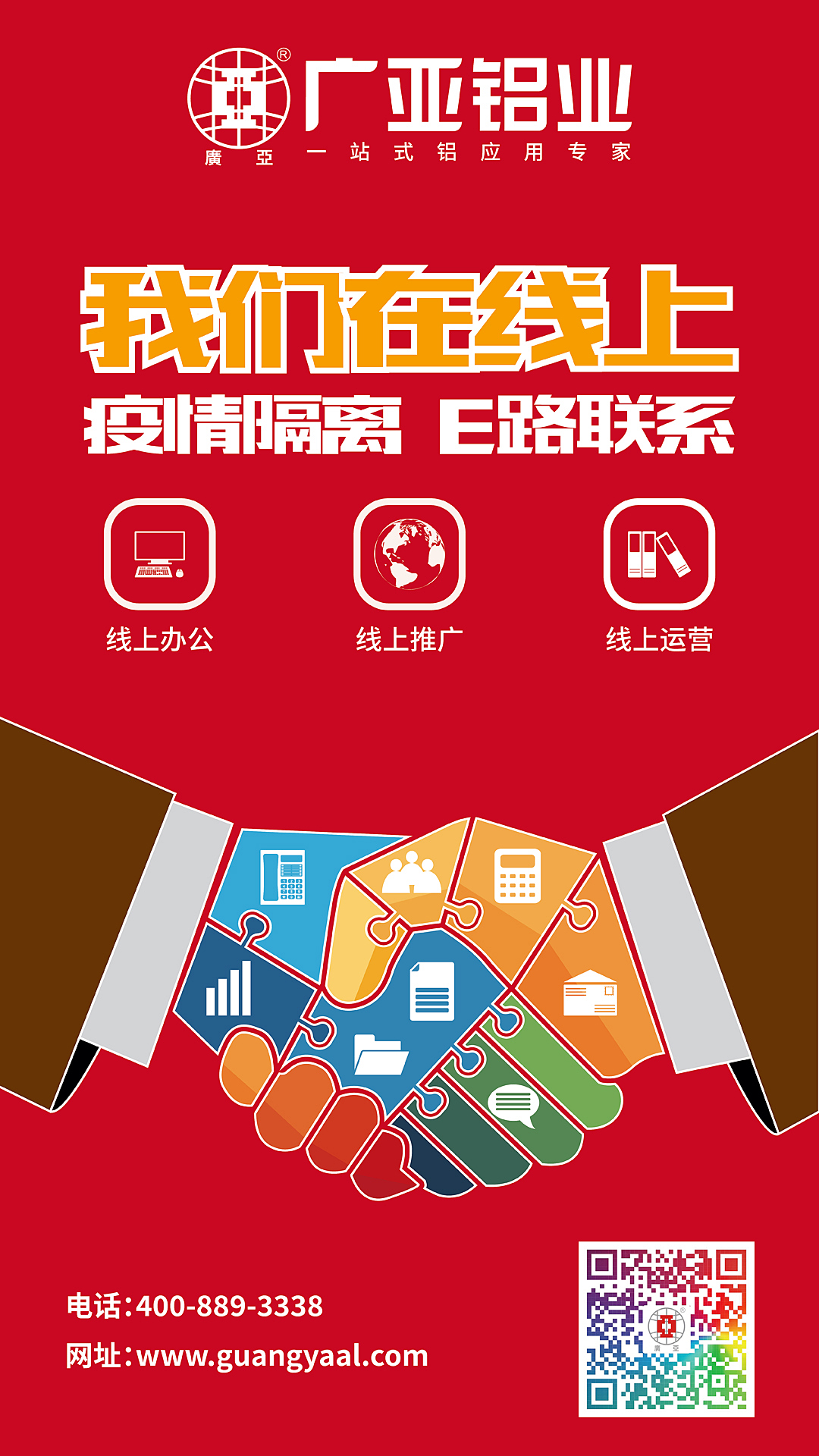 當(dāng)前正處于防控的關(guān)鍵時(shí)期,廣亞鋁業(yè)承諾:恪守崗位,時(shí)刻在線,與合作伙伴一起攜手作戰(zhàn),砥礪前行!公司各崗位人員均已就位,如有任何業(yè)務(wù)需要溝通處理,可隨時(shí)通過(guò)手機(jī)、微信、QQ、郵件等方式與我們聯(lián)系,我們將第一時(shí)間回復(fù)您。