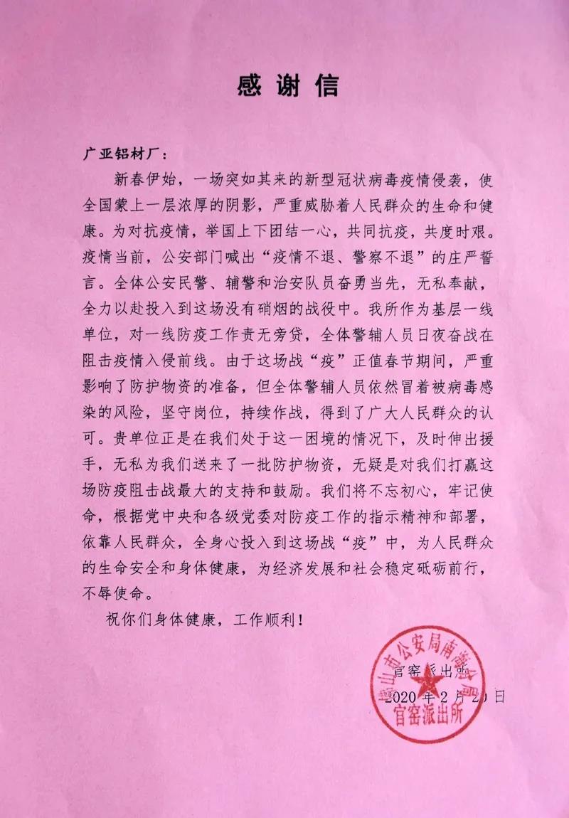 同抗疫、警民情!廣亞鋁業(yè)向社區(qū)民警贈送防護(hù)品!