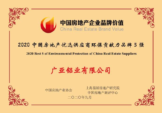 廣亞鋁業(yè)榮獲“2020中國房地產(chǎn)優(yōu)選供應(yīng)商環(huán)保貢獻(xiàn)力品牌5強(qiáng)”