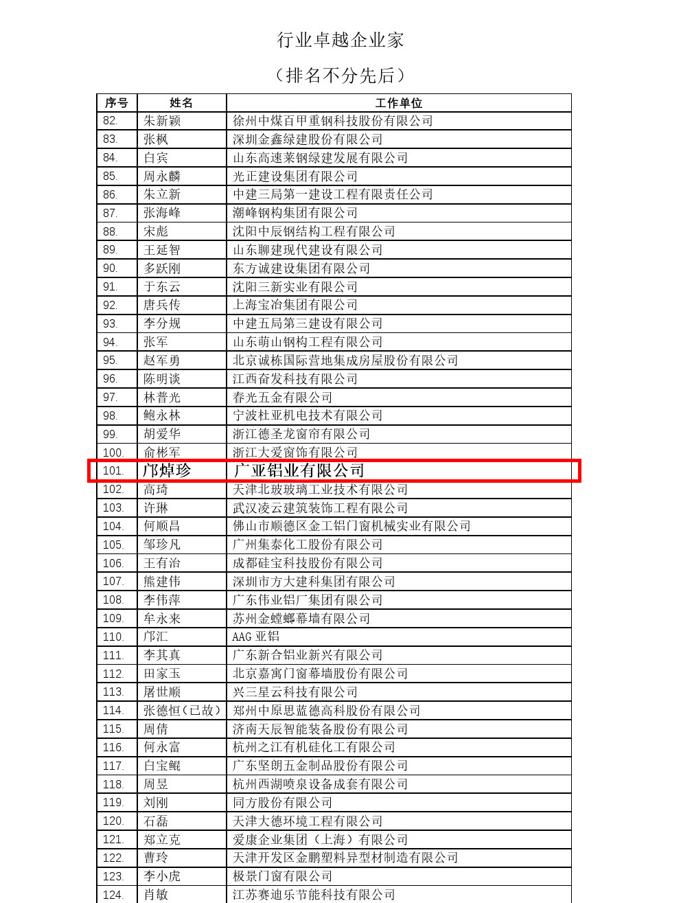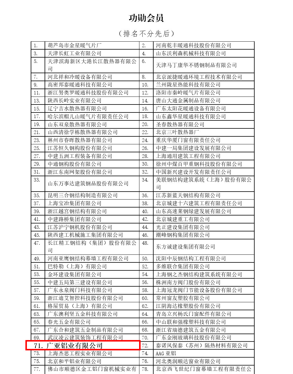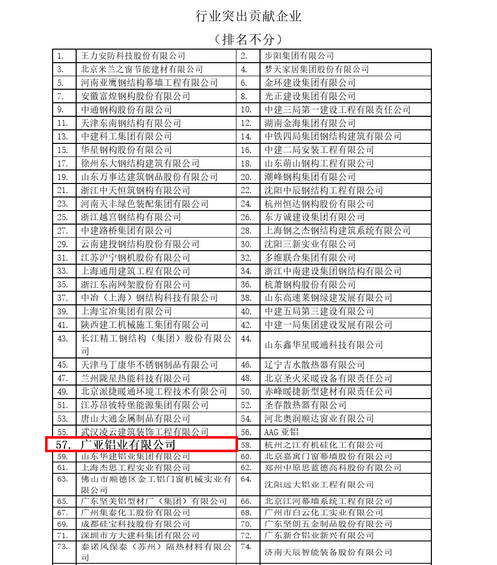 廣亞鋁業(yè)以積極參與協(xié)會(huì)事務(wù)和行業(yè)活動(dòng),堅(jiān)持科技創(chuàng)新助力行業(yè)高質(zhì)量發(fā)展的杰出貢獻(xiàn),入選為中國(guó)建筑金屬結(jié)構(gòu)協(xié)會(huì)成立四十周年的 “功勛會(huì)員”、 “行業(yè)突出貢獻(xiàn)企業(yè) ”;