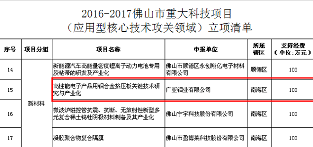 2017年我司申請的《高性能電子產(chǎn)品用鋁合金擠壓板關(guān)鍵技術(shù)研究與產(chǎn)業(yè)化》項目獲得佛山市首批重大科技項目(應(yīng)用型核心技術(shù)攻關(guān)領(lǐng)域)項目的立項肯定及100萬的資金獎勵,充分體現(xiàn)了我司突破該關(guān)鍵核心技術(shù)、提高自主創(chuàng)新能力,廣亞高性能電子產(chǎn)品用鋁合金擠壓板技術(shù)將更上一層樓。該項目的成功研發(fā)與推廣應(yīng)用將為行業(yè)的轉(zhuǎn)型升級起到很好的示范作用,打破國外的技術(shù)壟斷,帶動鋁型材加工行業(yè)產(chǎn)業(yè)結(jié)構(gòu)調(diào)整和高附加值方向發(fā)展。