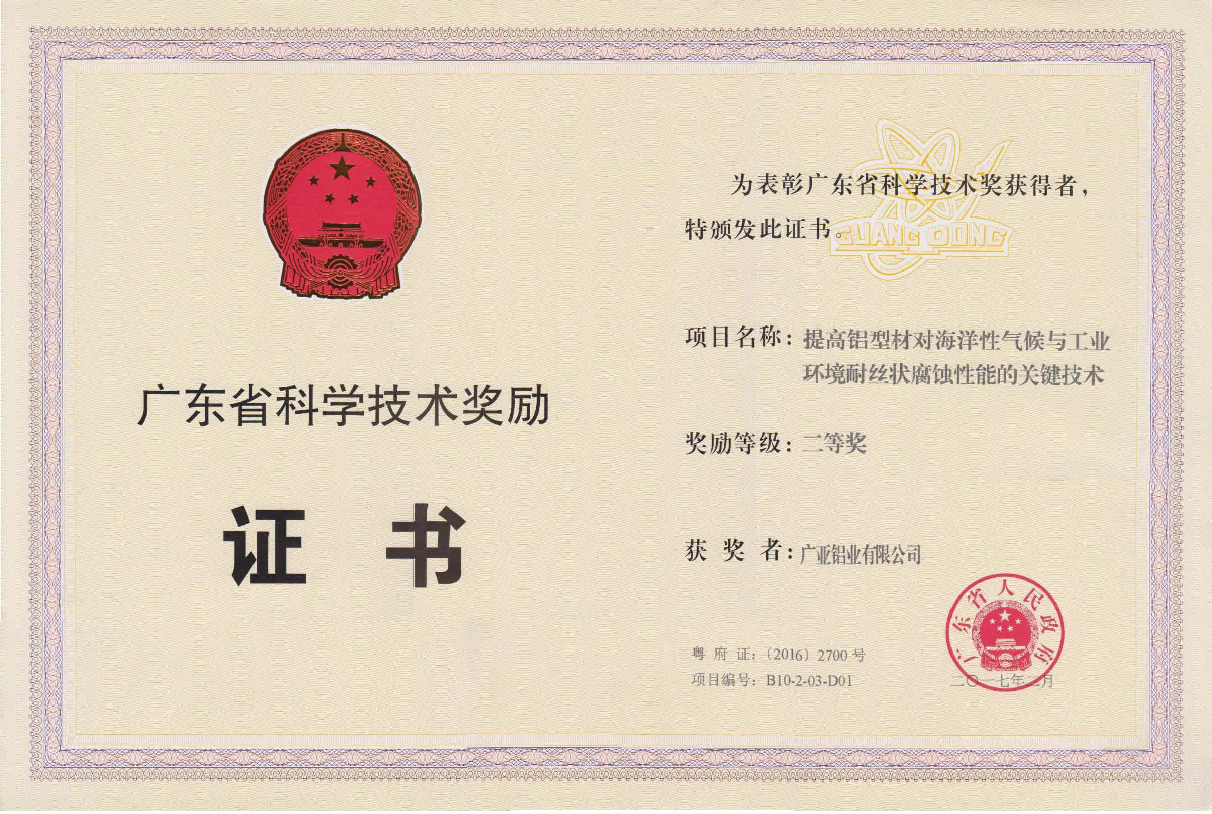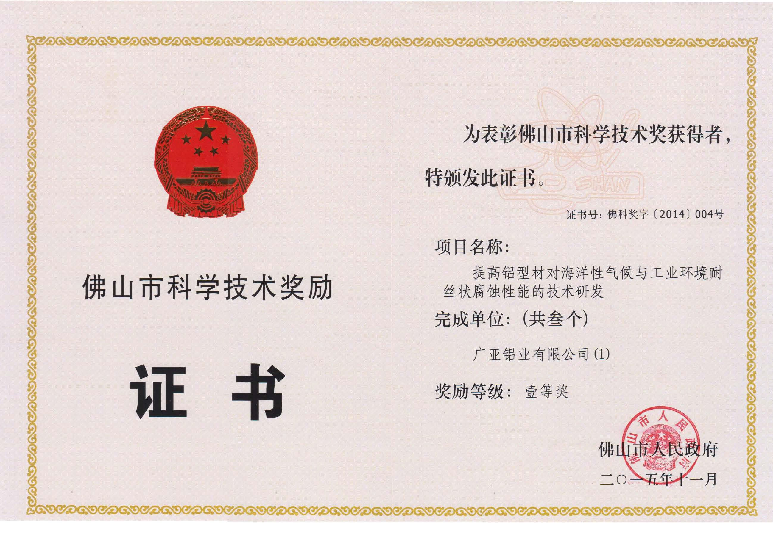 通過廣泛的產(chǎn)學(xué)研合作,公司科研成果碩果累累,近年來先后獲得中國有色金屬工業(yè)科學(xué)技術(shù)進步獎一等獎1項、二等獎3項、三等獎1項,佛山市科學(xué)技術(shù)獎一等獎1項、三等獎2項,2017年《提高鋁型材對海洋性氣候與工業(yè)環(huán)境耐絲狀腐蝕性能的關(guān)鍵技術(shù)》更是獲得廣東省科學(xué)技術(shù)獎二等獎。我司也重視知識產(chǎn)權(quán)保護,目前有效授權(quán)發(fā)明專利5項,實用新型專利59項,外觀專利115項。企業(yè)還積極參與起草和制修訂國際、國家和行業(yè)標準和聯(lián)盟標準達40多項,多次獲得技術(shù)標準優(yōu)秀獎勵。