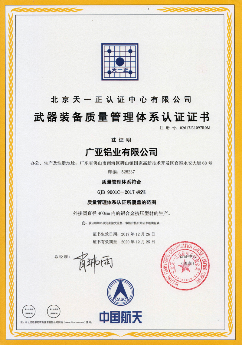 日前,廣亞鋁業(yè)成功獲得了由北京天一正認(rèn)證中心有限公司頒發(fā)的《武器裝備質(zhì)量管理體系認(rèn)證證書(shū)》,此次順利通過(guò)認(rèn)證評(píng)審,標(biāo)志著廣亞鋁業(yè)質(zhì)量管理體系符合“GJB 9001C-2017”標(biāo)準(zhǔn),體現(xiàn)了我司在質(zhì)量管理體系水平上質(zhì)的飛躍,也體現(xiàn)了我司“廣亞鋁材,航天品質(zhì)”的產(chǎn)品質(zhì)量承諾。