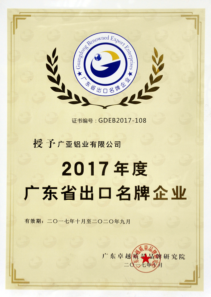 近日,2017年度“廣東省出口名牌企業(yè)”名單正式公布,廣亞鋁業(yè)有限公司榜上有名,是廣東省四家鋁型材上榜企業(yè)之一。