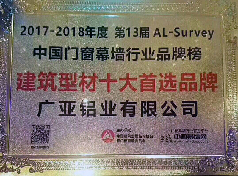 2018年3月10日,在展會(huì)開(kāi)始前舉辦的第24屆全國(guó)鋁門(mén)窗幕墻行業(yè)年會(huì)暨2018中國(guó)建筑經(jīng)濟(jì)廣州峰會(huì)上,由中國(guó)建筑金屬結(jié)構(gòu)協(xié)會(huì)主辦,中國(guó)幕墻網(wǎng)(ALwindoor.com)承辦的中國(guó)門(mén)窗幕墻行業(yè)大型讀者調(diào)查活動(dòng)暨“我最喜愛(ài)幕墻工程”評(píng)選活動(dòng)頒獎(jiǎng)禮如期舉行。廣亞鋁業(yè)在入圍的193家企業(yè)、18項(xiàng)幕墻工程中脫穎而出。榮獲中國(guó)建筑鋁型材十大首選品牌。據(jù)悉,該評(píng)選活動(dòng)已連續(xù)成功舉辦了十三屆,始終堅(jiān)持“沒(méi)有黑馬、實(shí)至名歸”的評(píng)選風(fēng)格,已成為廣大房地產(chǎn)開(kāi)發(fā)商、設(shè)計(jì)院以及行業(yè)專(zhuān)家、顧問(wèn)咨詢公司等讀者群體進(jìn)行品牌選擇和產(chǎn)品選購(gòu)的重要參考依據(jù)。而每屆的“我最喜愛(ài)幕墻工程”評(píng)選,更是以“新、奇、高、大”的入圍標(biāo)準(zhǔn),被喻為“魯班獎(jiǎng)”的前哨站!